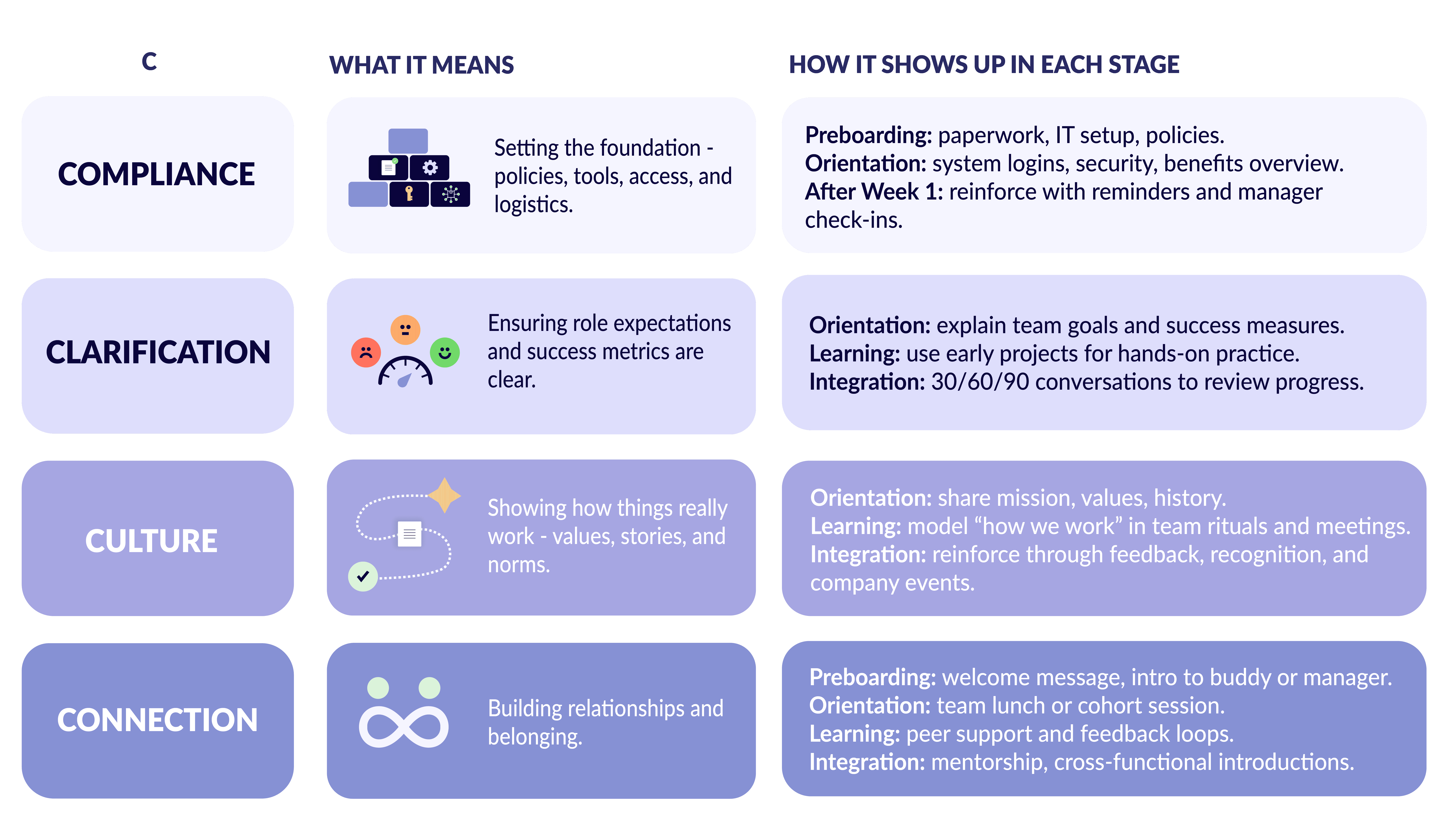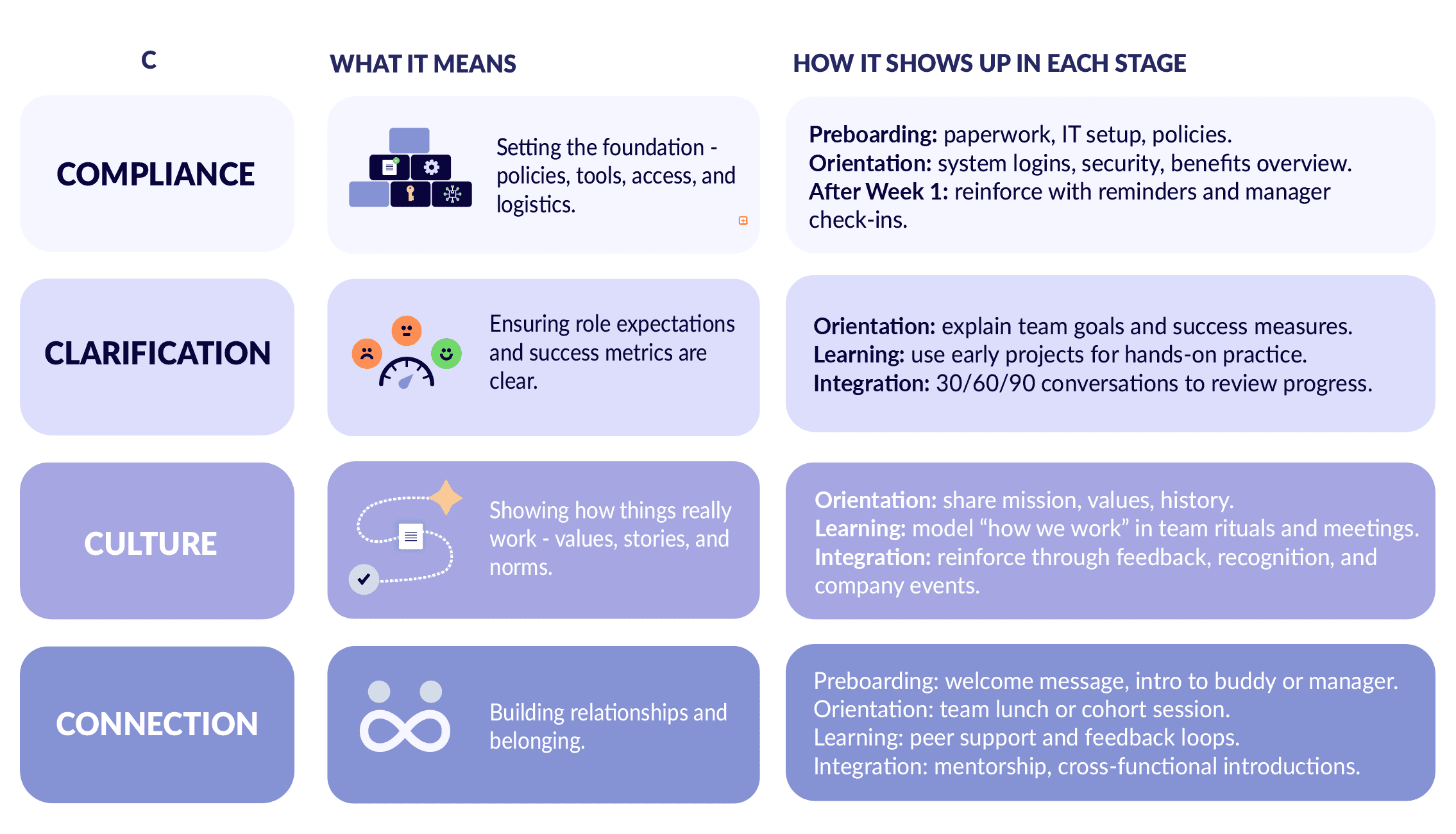 Every effective onboarding program intentionally reinforces four essentials: Compliance, Clarification, Culture, and Connection.