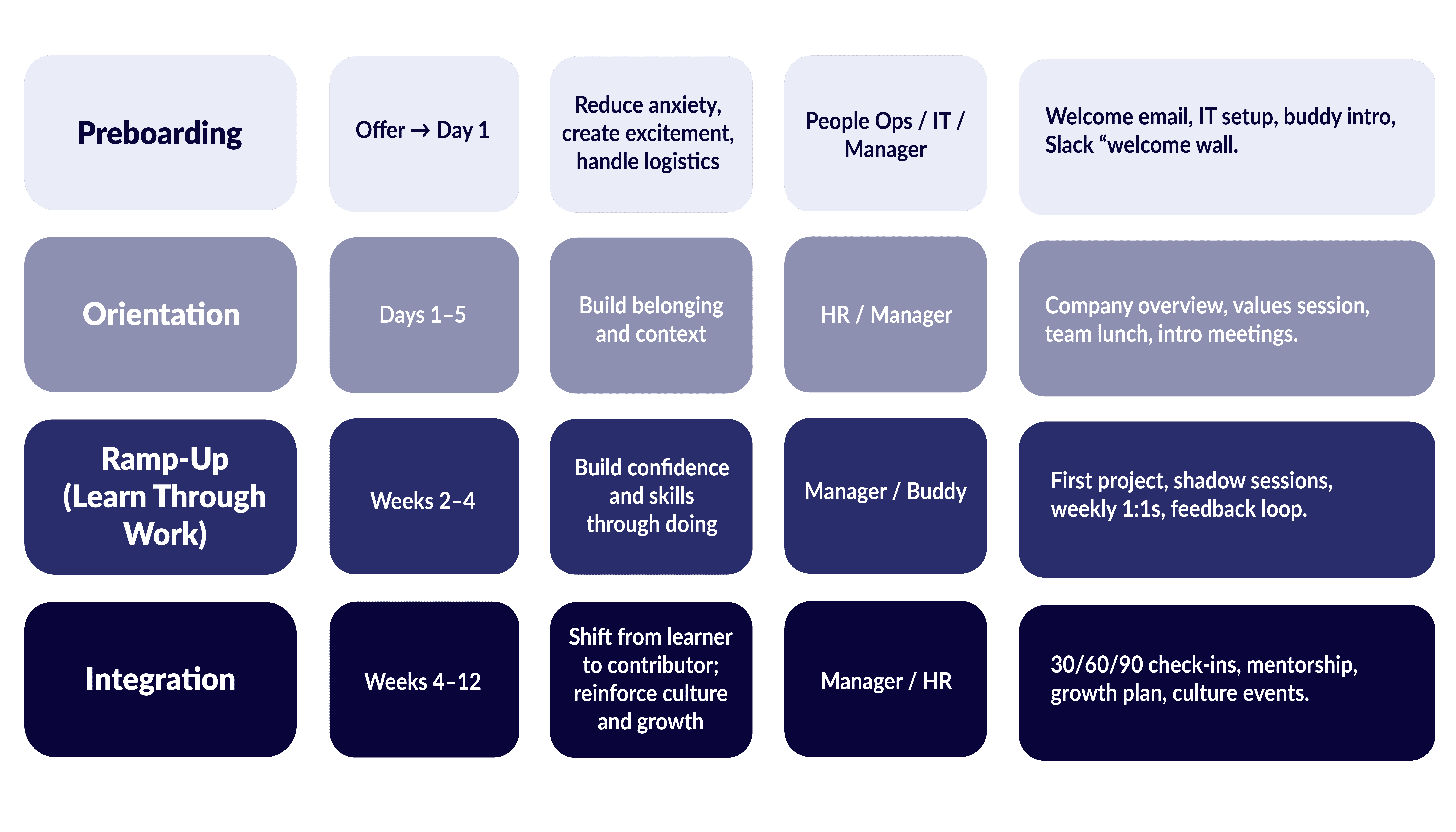 Together, these lenses (stages, content) create an onboarding program that is structured, human, consistent and scalable.